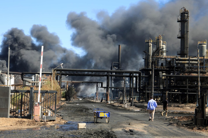 今年1月底,在苏丹首都喀土穆北部杰利地区,遭破坏的喀土穆炼油厂冒出浓烟。